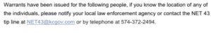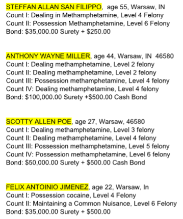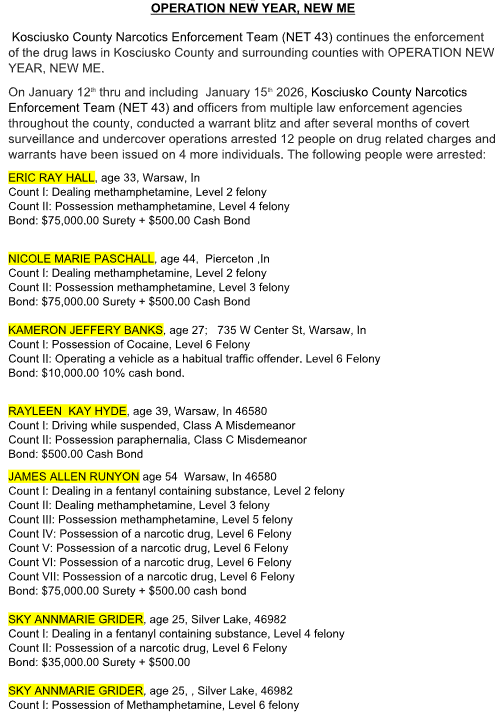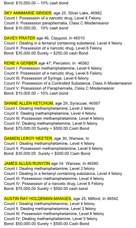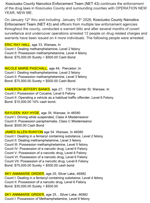 The sweep was led by the Kosciusko County Narcotics Enforcement Team (NET43) over a four-day period that ended Thursday, according to a news release from the Kosciusko County Sheriff’s Office.