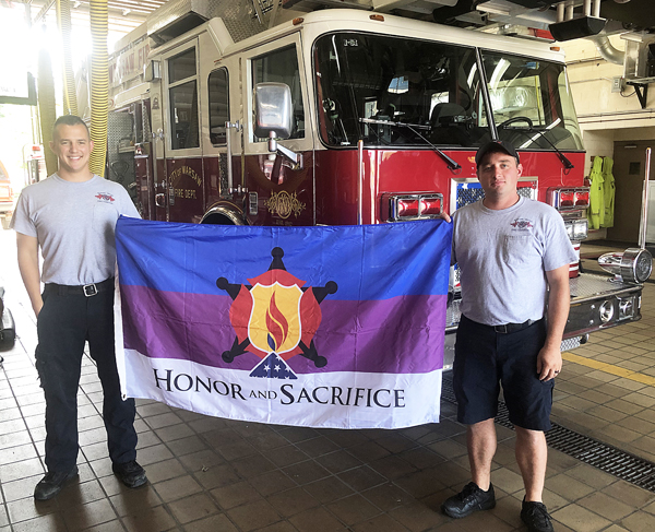 On The Honor and Sacrifice flag, the blue field symbolizes nationally the law enforcement community. The purple field signifies mourning for a loss in the firefighter community. The white field, the folded flag and the flame represent the same things as they do on the Honor and Remember flag. The black star represents those who wear the distinctive badge, including the sheriff and marshal services. The red Maltese cross recognizes all individuals in the emergency response communities. The gold shield recognizes all public safety representatives who wear the shield and have made the ultimate sacrifice in the line of duty.