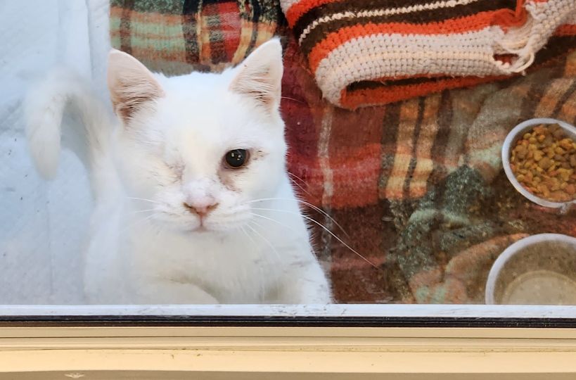 The building features numerous large windows that provide plenty of natural light inside while also allowing arriving visitors to see some of the cats that are available.