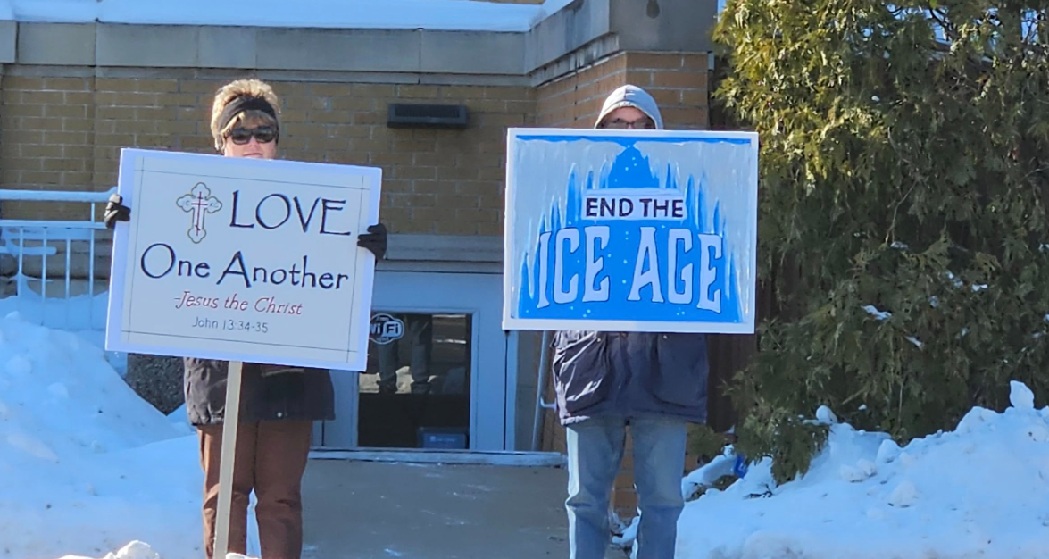 Melinda Sharp was there with her husband, Dan. Her sign read, Love One Another,” and his read, “End the Ice Age.”