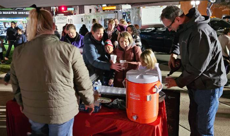 At left, with her back to the camera, Amy Chambers, with Fellowship Missions, serves up blueberry, cherry and peach turnovers to a line of customers Friday night at the Christmas celebration in downtown Warsaw. Chambers is also involved with the Fellowship Mission’s food truck. News Now Warsaw photo by Dan Spalding.