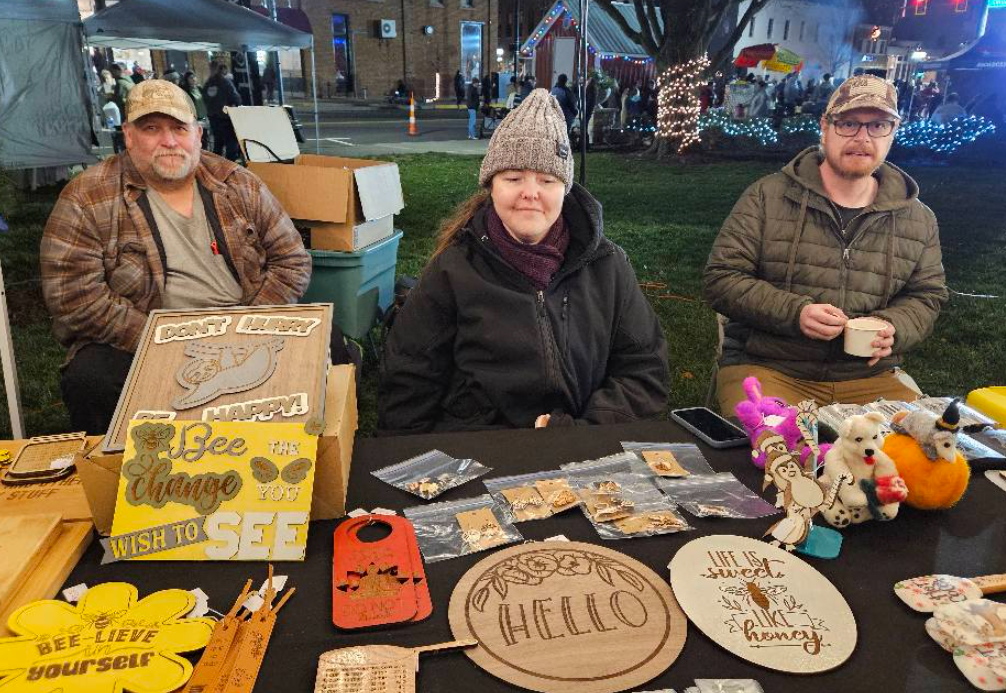 From left, Damon Fritzinger, Sky Earl and Dustin Earl brought a collection of items for sale to the Friday night celebration. Their products include handmade wood boxes and items made with an automated carving machine and accented with a touch of woodburning. Fritzinger is from Greencastle. The Earls live in Indianapolis. They said Friday marked the first time they were attempting to sell items at an event and were enjoying themselves. News Now Warsaw photo by Dan Spalding.