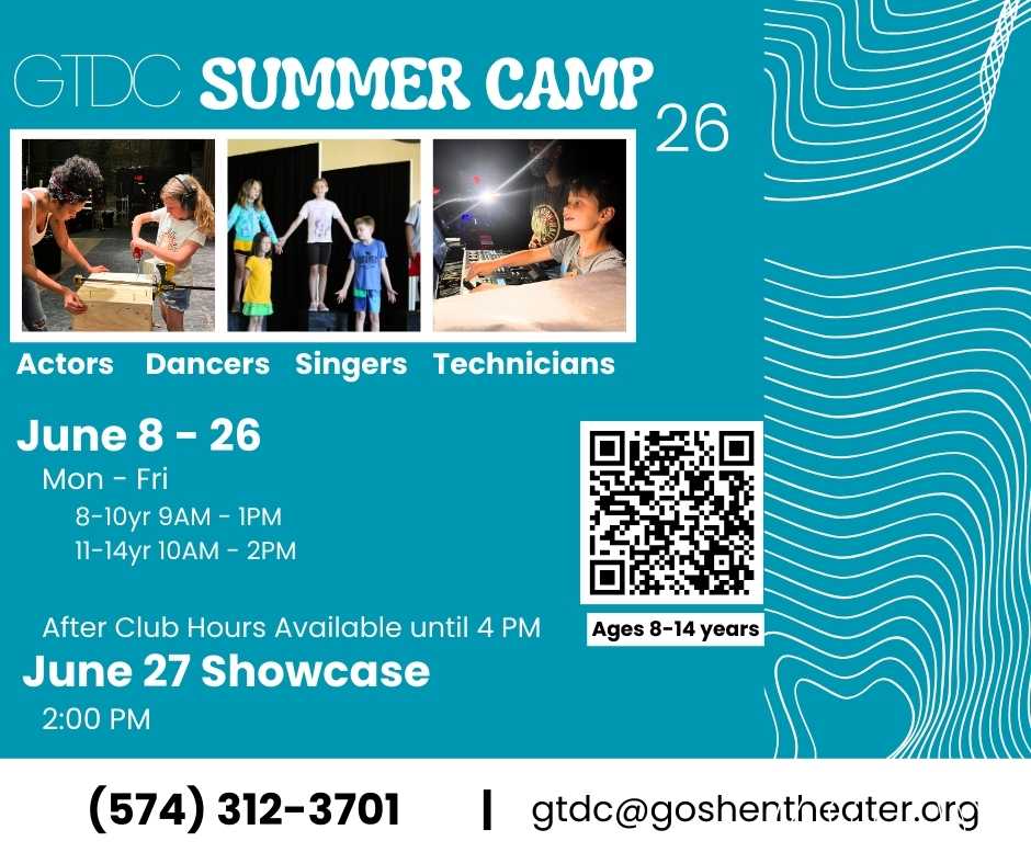 Goshen Theater Drama Club’s Summer Camp runs June 8-26, with a final showcase on June 27 at 2PM. Campers who choose the “Performer Track” will spend their days rotating between Acting, Dance, and Music Classes. They will use improv and devised theater to create original plays to be performed at the final showcase, along with learning and creating multiple music and dance numbers. Campers who choose the “Technician Track” will spend their days learning how to operate lighting and sound equipment; building props, costumes, and set pieces; and learning how to create and run a show from behind the scenes.