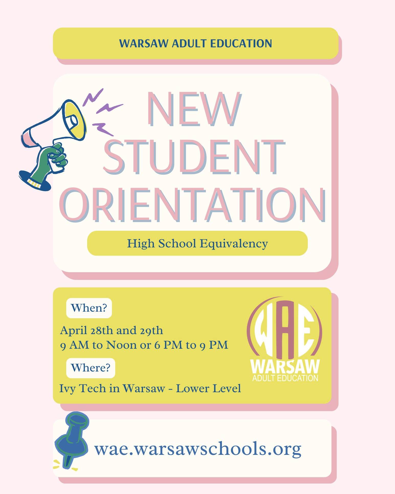 Warsaw Adult Ed is hosting a New Student Orientation at the Ivy Tech location in Warsaw. The orientation takes place Tuesday, April 28 & Wednesday, April 29, from 9 am to 12 pm or 6 pm to 9 pm. The cost is $0.00 to prep for your Diploma!