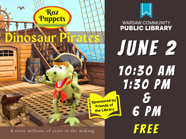 Set sail on the high seas with this Dinosaur Pirate puppet adventure! A treasure chest of music, antics, and audience participation. Sponsored by Friends of the Library.