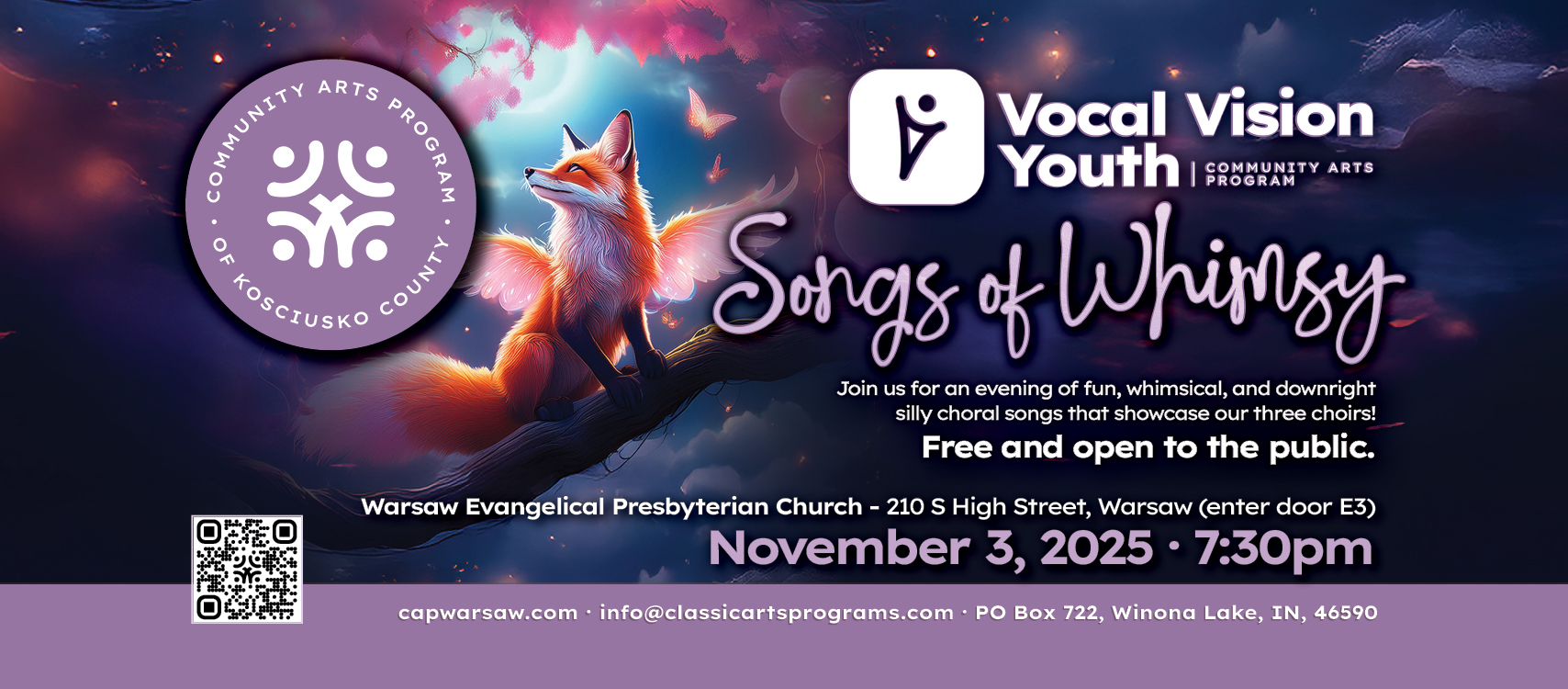 Community Arts Program of Kosciusko County presents the Vocal Vision Youth performance of “Songs of Whimsy”. This program features choral arrangements that will bring an upwelling of joy.