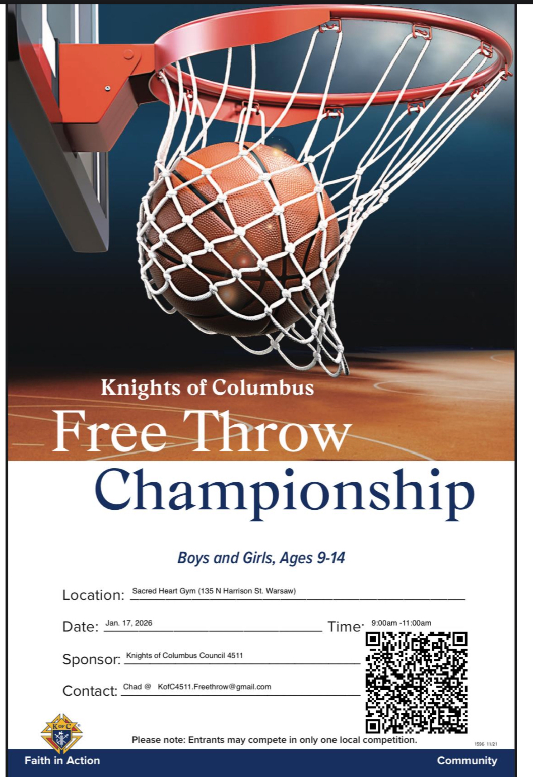 Knights of Columbus Council 4511 invites boys and girls age 9-14 to a Free Throw competition (age groups, boys and girls separate).