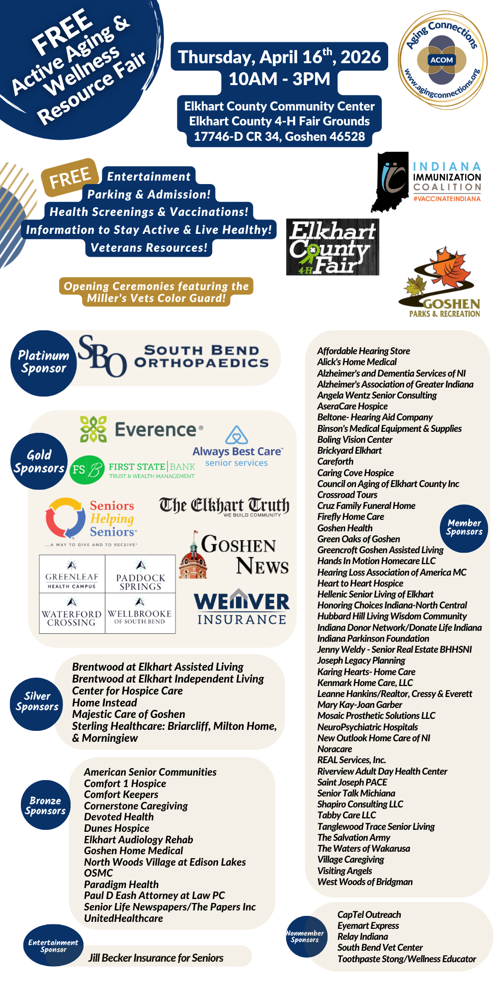 Elkhart County Community Center 17746-D CR 34, Goshen, IN, United StatesJoin us on Thursday, April 16th, from 10 AM to 3 PM for the Free Elkhart County Active Aging & Wellness Resource Fair. The event will take place at the Elkhart County Community Center, located at the Elkhart County 4-H Fairgrounds, 17746-D CR 34, Goshen, IN 46528. Admission and parking are free! Enjoy complimentary health […]