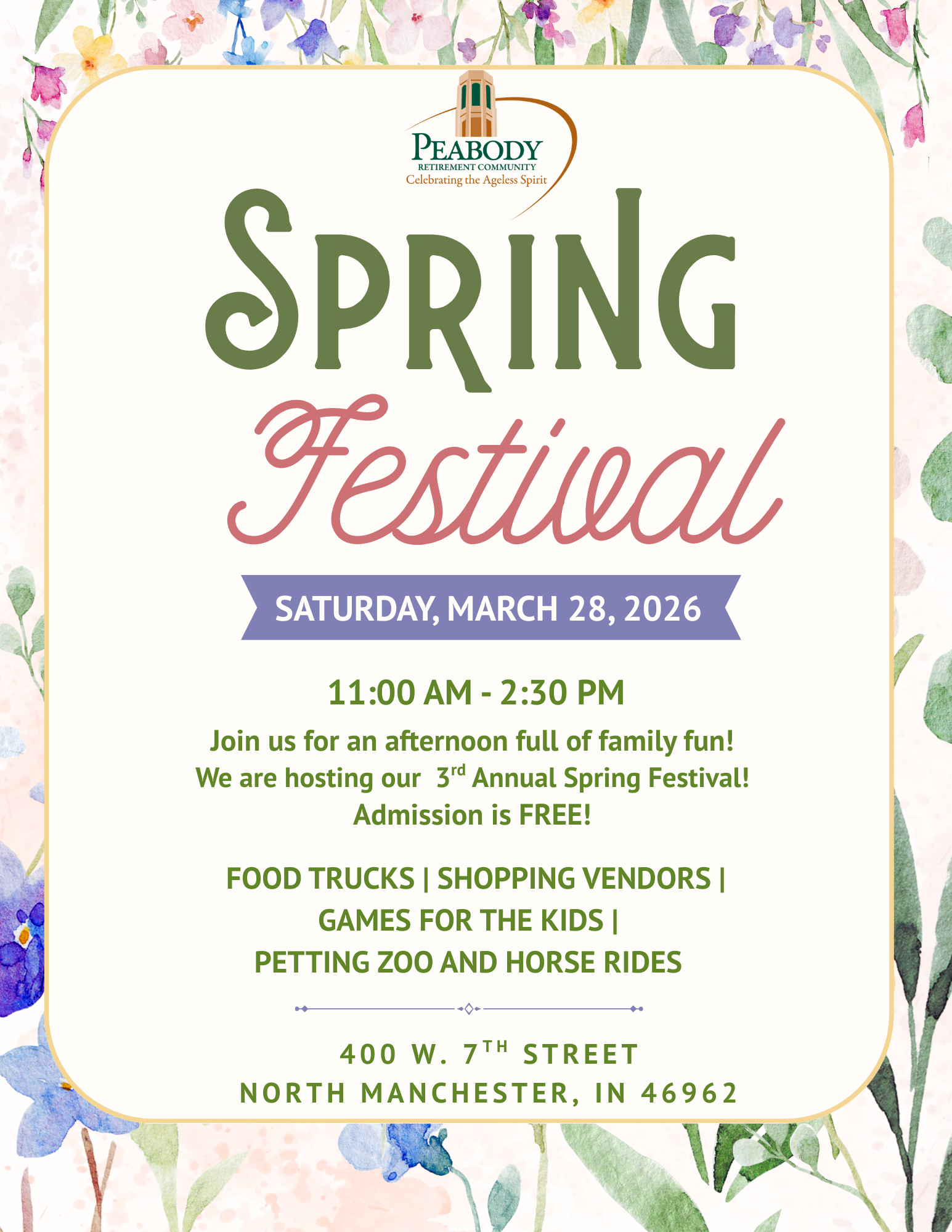 400 W Seventh St, North Manchester, IN 400 W Seventh St, North Manchester, United StatesMarch 28th from 11-2:30! Admission? Absolutely free!!! There will be shopping vendors, a HUGE variety of goodies from food trucks, snuggle up with furry friends at the petting zoo, gallop away on horse rides, and enjoy free games for kids of all ages