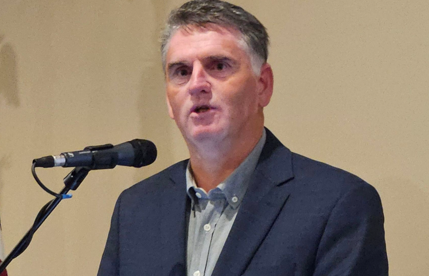 U.S. Rep. Jim Banks talks to dinner guests Thursday night via a video screen from Washington D.C.. News Now Warsaw photo by Dan Spalding.