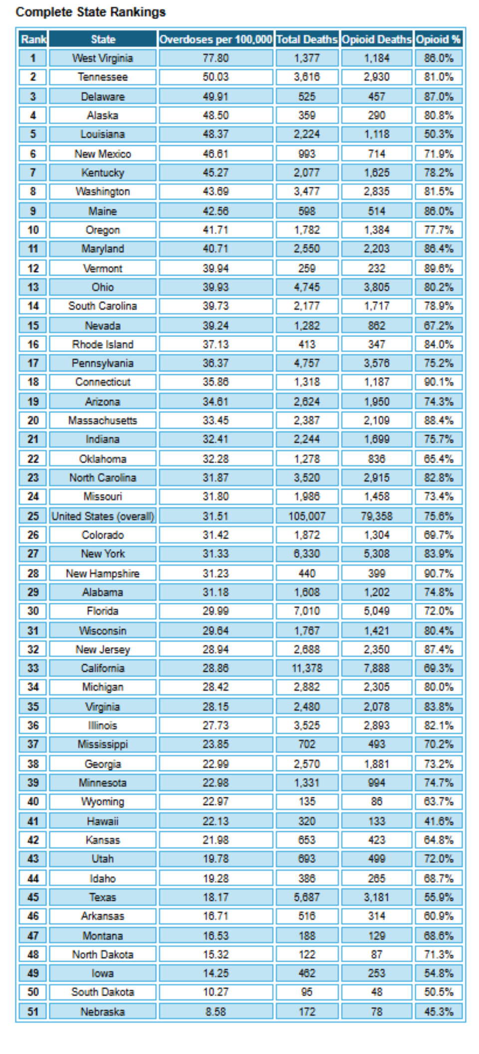 New research has revealed the states with the highest mortality rates from drug overdoses.
