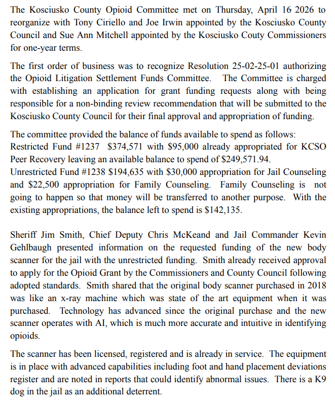 The Kosciusko County Opioid Committee on April 16, reorganized with Tony Ciriello and Joe Irwin appointed by the Kosciusko County Council and Sue Ann Mitchell appointed by the Kosciusko County Commissioners for one-year terms.