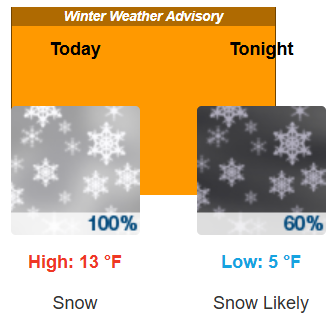 Warsaw’s Sunday forecast: High near 13 with wind chill values as low as -10. Winds will be 10 to 15 mph, with gusts up to 20.