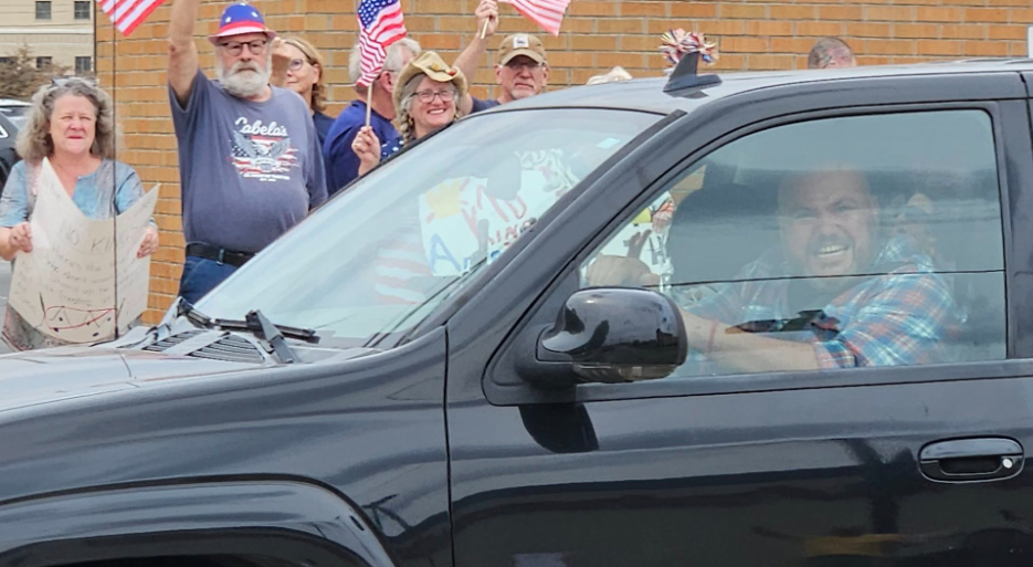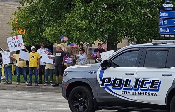 The Warsaw gathering included many peole waving American flags and it remained peaceful despite efforts by a few counterprotesters in cars who tried to send a message by blaring their horns and revving car engines.