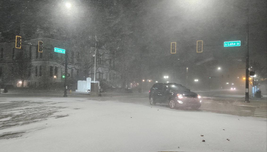 A vehicle turns off Center Street and onto South Lake Street early Monday morning in Warsaw amid a period of gusty snow. Many streets at the time were snowy and slick. News Now Warsaw photo by Dan Spalding.
