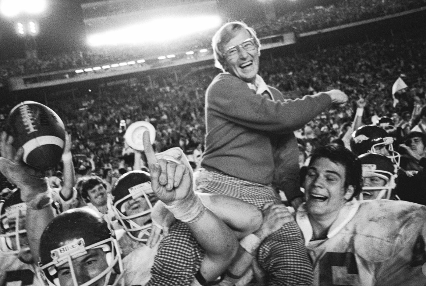 He didn’t just win games, either. The diminutive coach captivated fans with his occasionally fiery sideline demeanor, his self-deprecating wit and folksy phrases all while demanding excellence, on and off the field, from his much larger players.