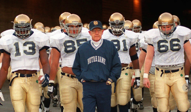 Notre Dame Head Coach Lou Holtz leads his players onto the field at Los Angeles Coliseum against Southern California in 1996. AP Photo.