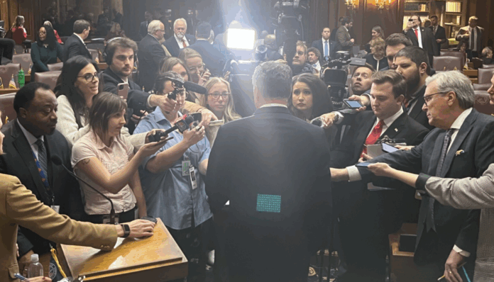 House Speaker Todd Huston, R-Fishers, takes questions from reporters after Organization Day on Nov. 18. 2025. (Photo by Niki Kelly/Indiana Capital Chronicle)