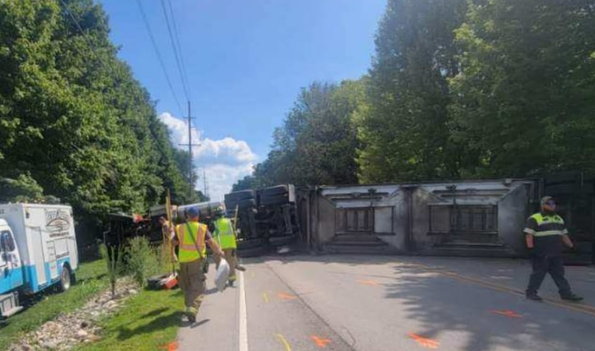 A truck hauling grain flipped and lost his load and came to rest blocking both lanes.