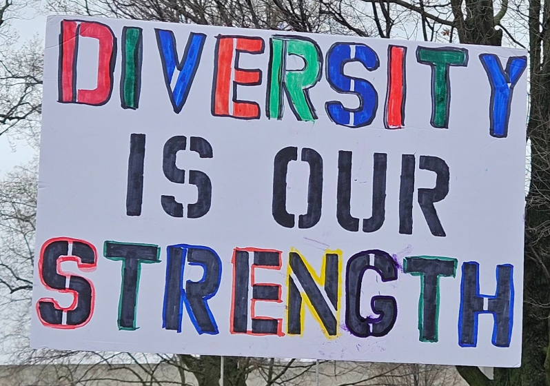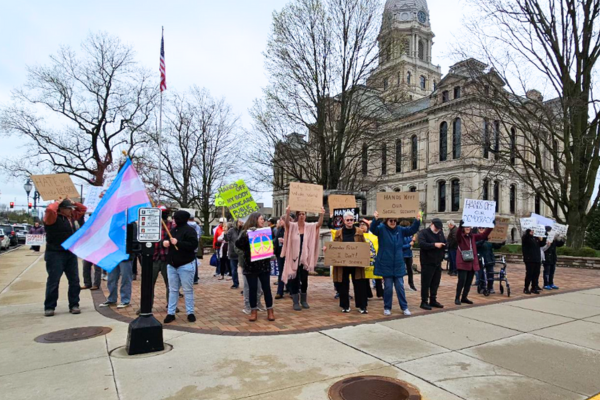 Some wondered how many would show up for a protest in chilly and damp conditions at the courthouse lawn, but many were pleased after some 75 people carried signs and chanted slogans at the corner of Center and Buffalo streets.