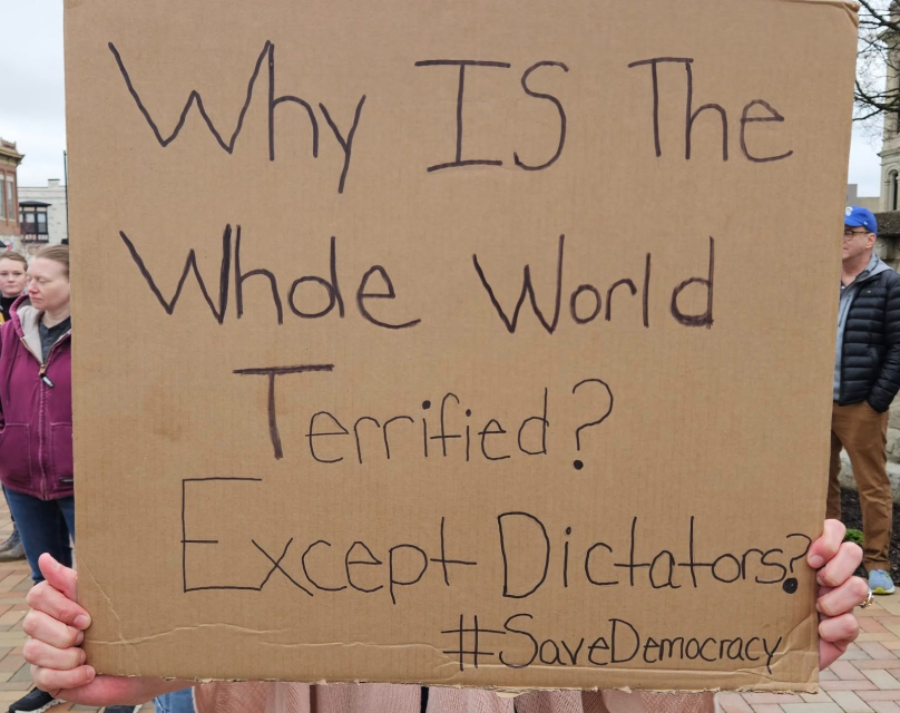 Handmade signs addressed numerous issues that have coalesced in the past 90 days as President Trump has issued wide-ranging executive orders and implemented massive tariffs on many of the United States’ strongest allies — as well as China and minuscule countries most Americans have never heard of.