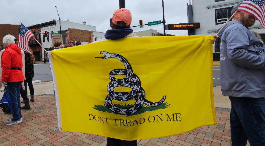 One woman at the protest carried an outstretched yellow Gadsden Flag with the historic phrase, “Don’t Tread On Me,” which has been fully embraced by conservatives in recent years.