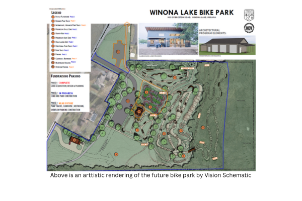 “We’re excited to complete Phase 1 fundraising for the Winona Lake Bike Park,” said Mike Cusick, KCV Cycling President. “We’ve now paid off our mortgage and completed the initial design of the park. We are going to start building the bike park this fall while we continue to fundraise for the next two phases.”